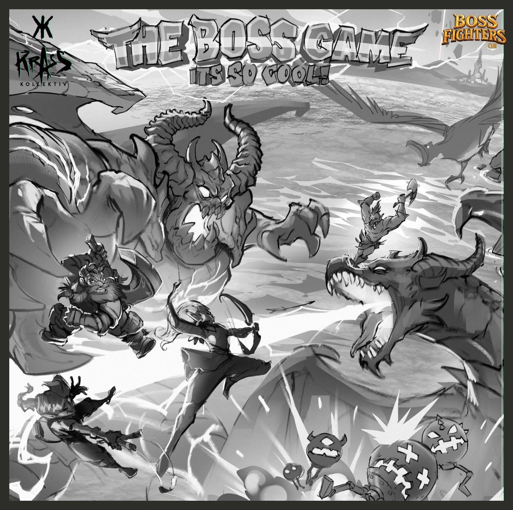 The cover of Boss Fighters QR was designed to immediately stand out from today’s crowded board game shelves. By carefully balancing vibrant colors and strong contrasts, we created an illustration that not only captures the energy of epic boss battles, but also differentiates the game visually from other titles on the market.