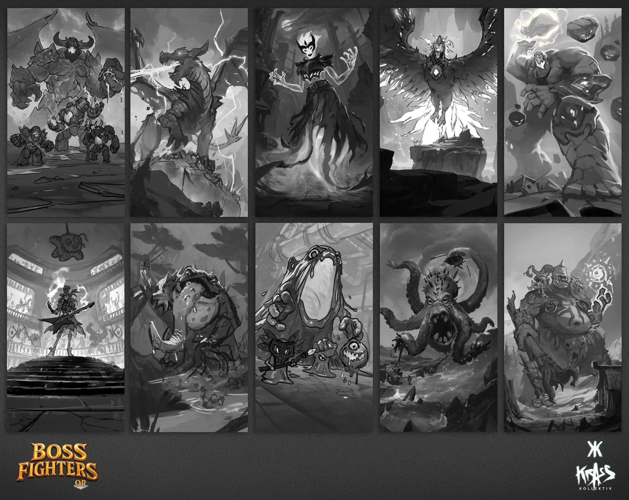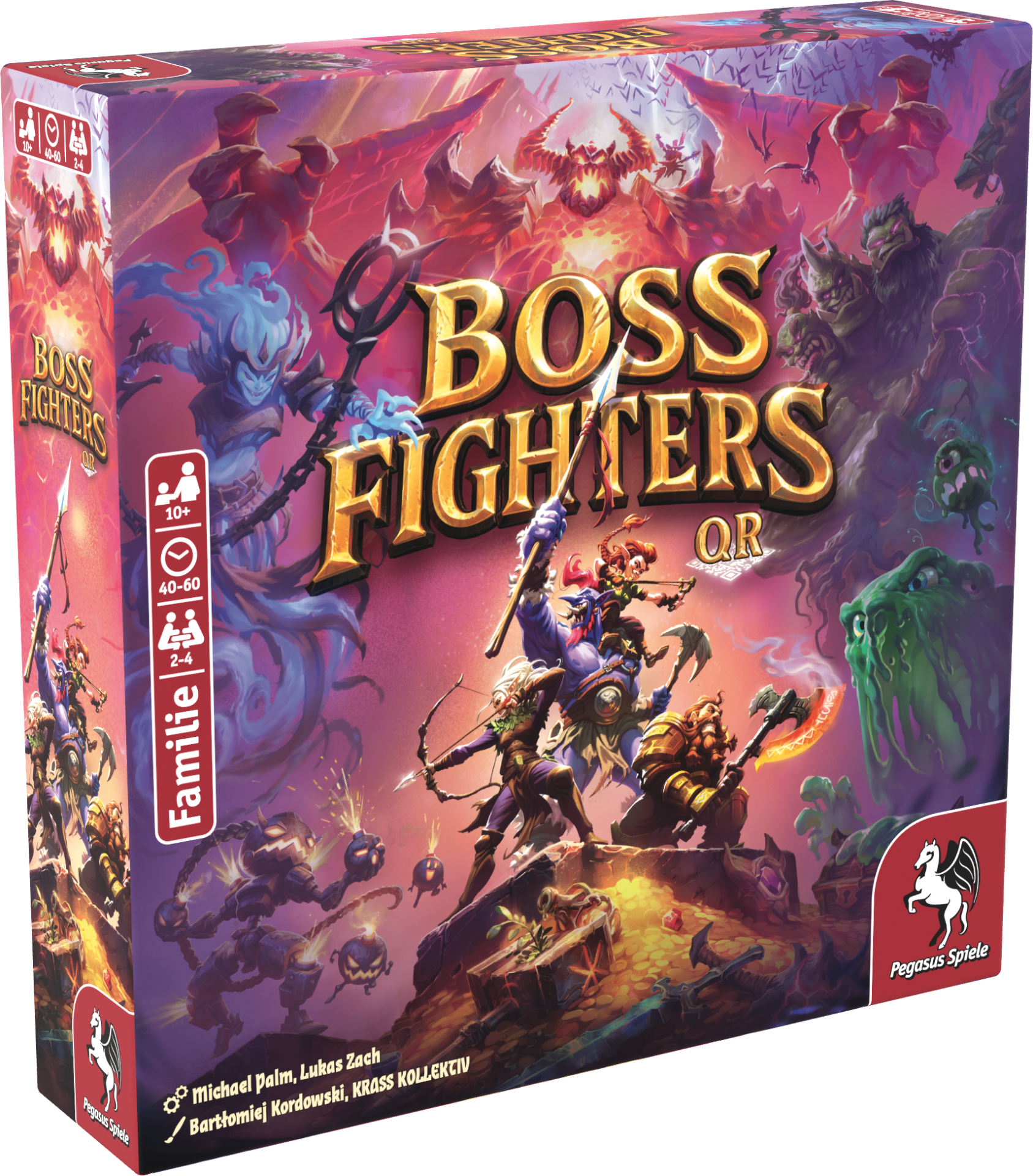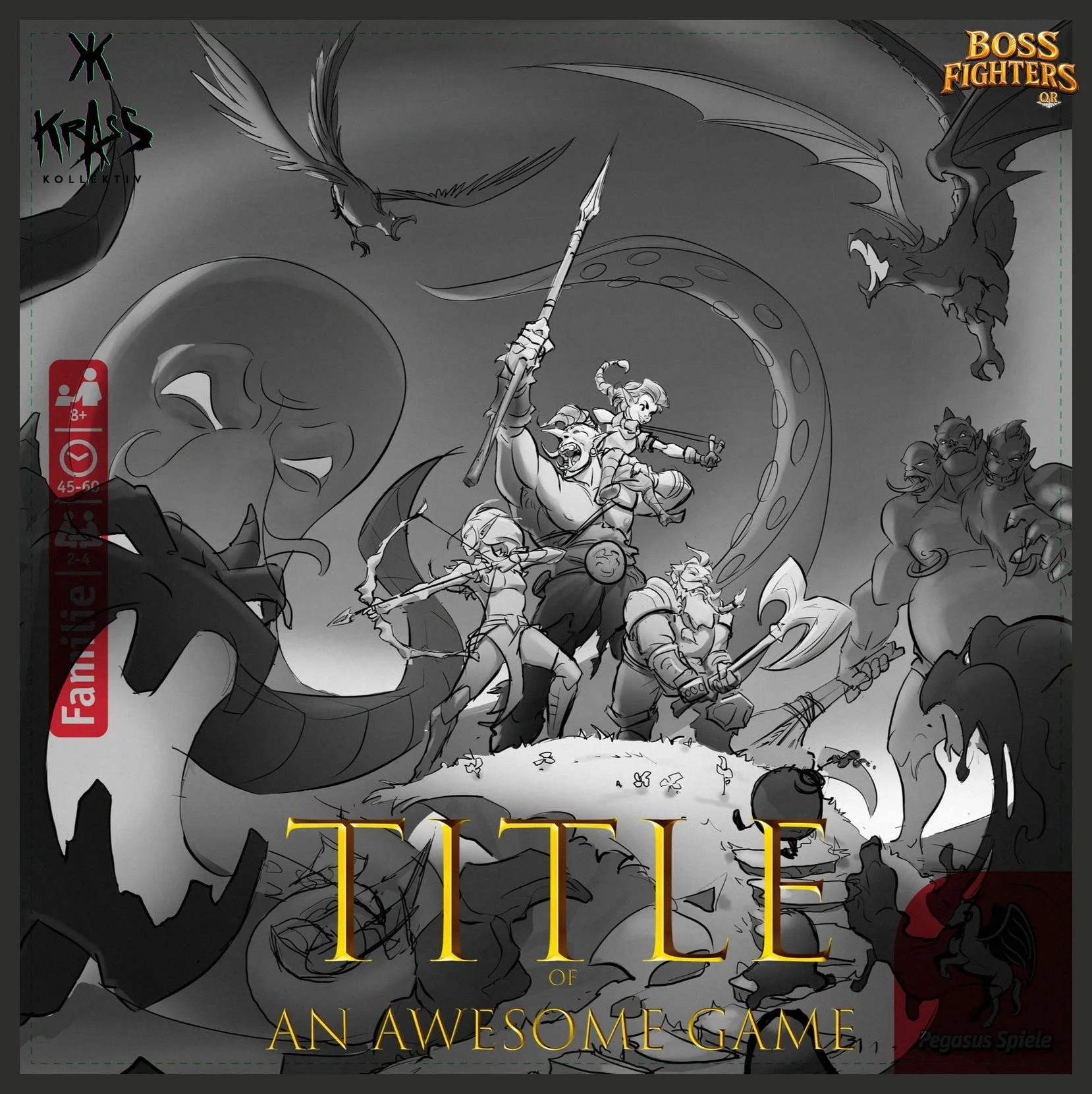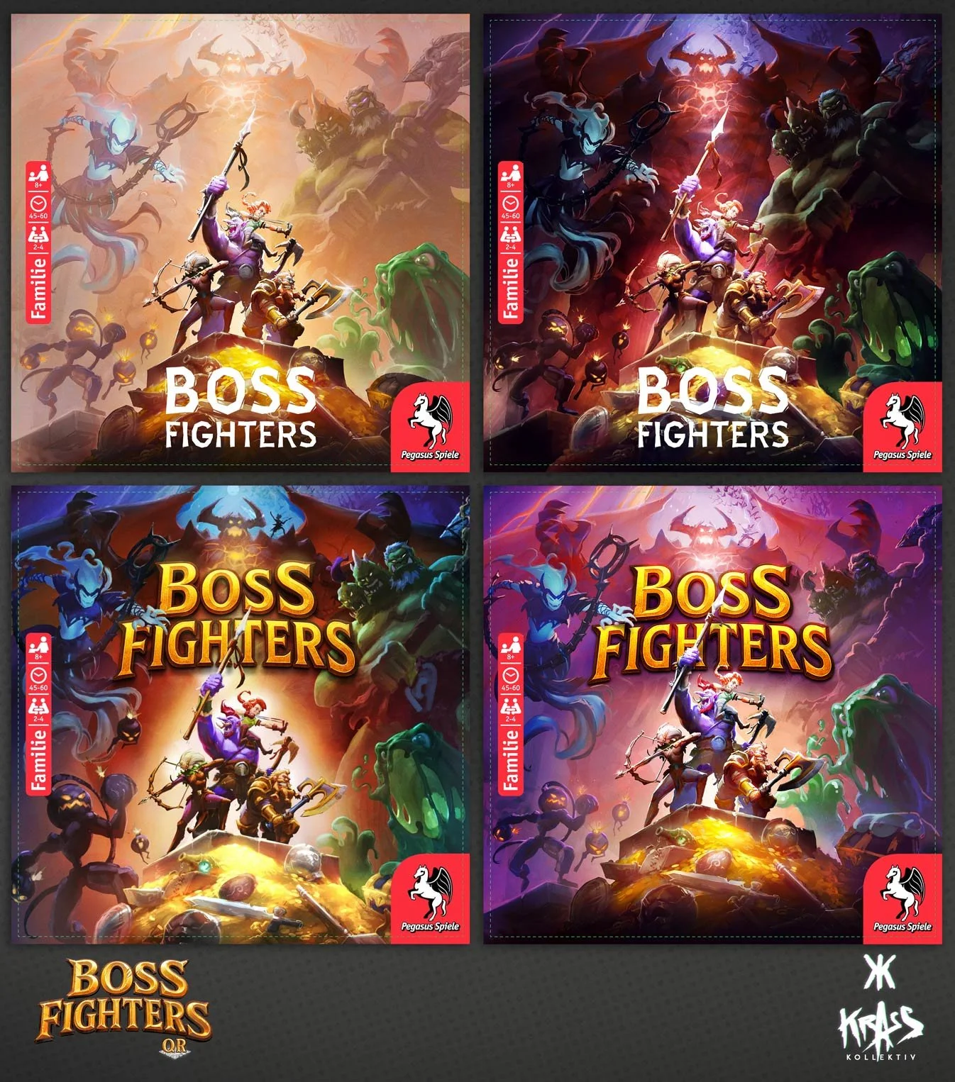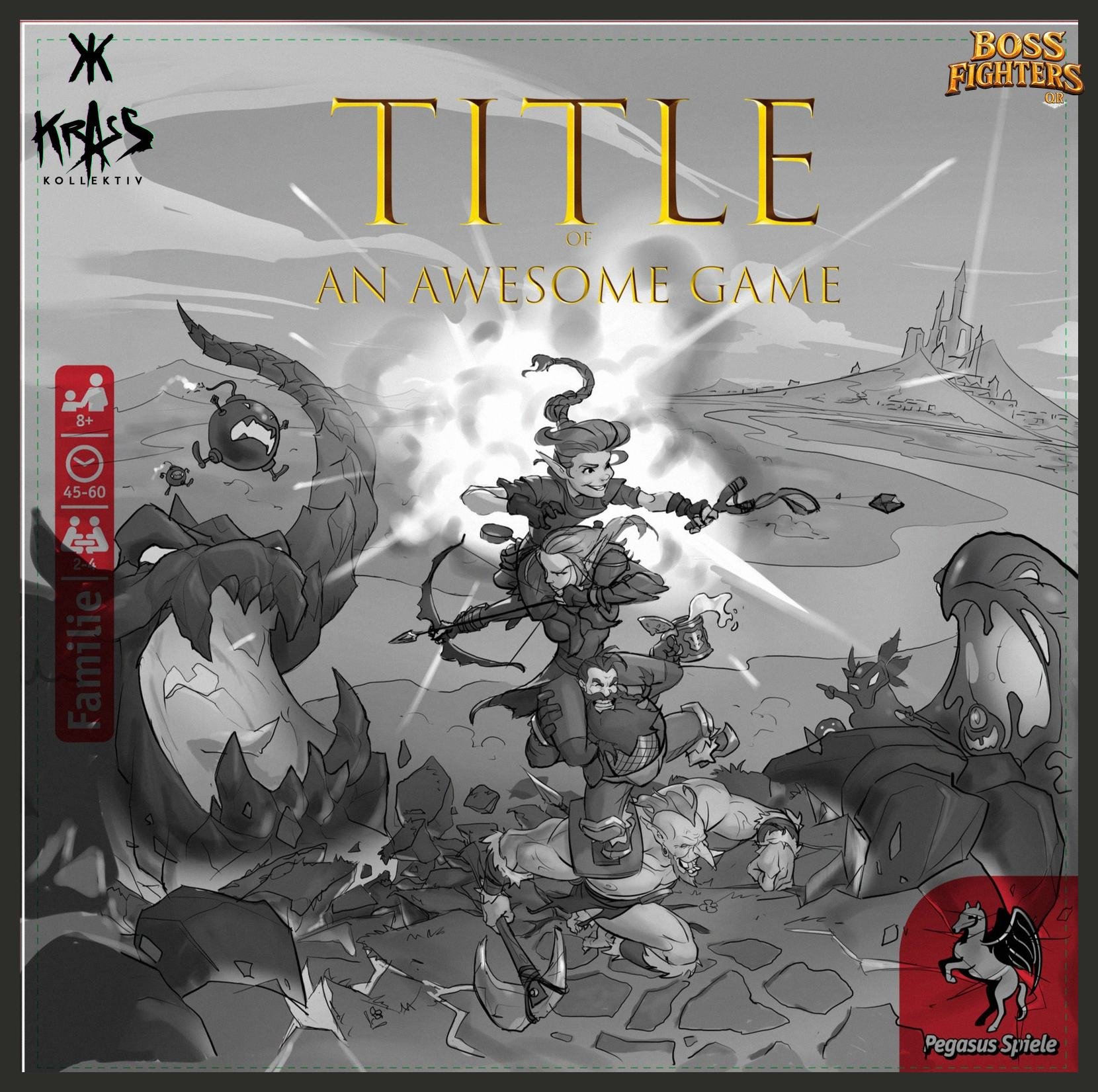 We created the logo, cover illustration, hero character designs, and boss concepts for Boss Fighters QR, a cooperative hybrid board game by Pegasus Spiele. Combining strategic card play with app-powered boss battles, the project allowed us to develop a complete visual identity - from a striking, memorable logo and iconic fantasy heroes to challenging bosses with unique abilities.